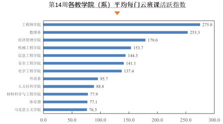 7、第14周各教學院(系)的課均活躍指數在76.3-275之間。