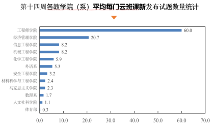 6、第14周各教學院(系)的課均新發布試題在0.3-60之間,全校平均每門云班課新發布試題數9.9。