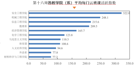 4、第十六周各教學院(系)的課均活躍指數(shù)在77.1-322之間,全校平均每門云班課活躍指數(shù)159。