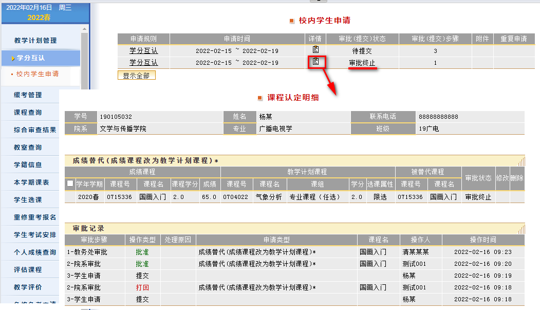 該學生的學分互認申請審批全部通過后,該學生的申請審批狀態將變更為“審批終止”。點擊詳情查看課程認定明細。審批終止后,將同步修改該學生的個人教學計劃及相關成績。