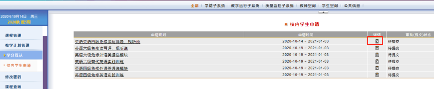 1、 登錄教務在線個人賬戶,點擊學分互認-校內學生申請,出現下面的頁面(圖1)。