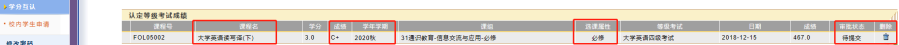 2、 申請用英語四六級成績替代外語類通選課的,將會在申請學期成績單上增加一門課,課程號:FOL005,課程名:外語通選類課程,學分為2學分,該課程屬于外國語言文化模塊的通選模塊;其他的課程按照所申請課程的實際名稱錄入當前學期的成績庫。錄入的課程成績按照《通識教育“外國語言文化”模塊課程免修成績認定管理辦法(試行)》規定的成績錄入。