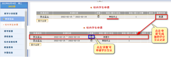 該學生的學分互認申請審批全部通過后,該學生的申請審批狀態將變更為“審批終止”。點擊詳情查看課程認定明細。