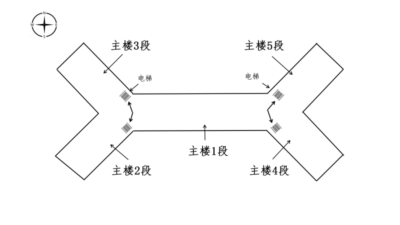 主樓在清源校區(qū),樓號是1號樓,共有五段,中間為1段,西側為2、3段,東側為4、5段,如圖2。主樓的教室用四位數(shù)字表示,第一個數(shù)字表示“段”,第二個數(shù)字表示樓層,其余兩位數(shù)字表示順序號。例如,“1#主樓-2501”表示“1號樓即主樓的2段五層01號教室”。