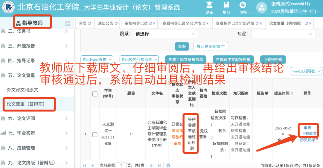 學(xué)生在畢設(shè)管理系統(tǒng)上傳畢業(yè)設(shè)計(jì)(論文)定稿,指導(dǎo)教師應(yīng)在系統(tǒng)下載原文認(rèn)真審核學(xué)生的論文定稿,避免出現(xiàn)學(xué)生上傳錯(cuò)論文版本或?qū)W生論文不過(guò)關(guān),但依然檢測(cè)的情況。指導(dǎo)教師“審核通過(guò)”后,系統(tǒng)自動(dòng)出具檢測(cè)結(jié)果。