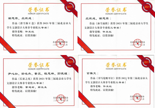 近日,2021年北京市大學(xué)生文創(chuàng)設(shè)計大賽落下帷幕,我校喜獲非專業(yè)組三等獎四項,這是我校首次參加文創(chuàng)設(shè)計類競賽并獲獎。