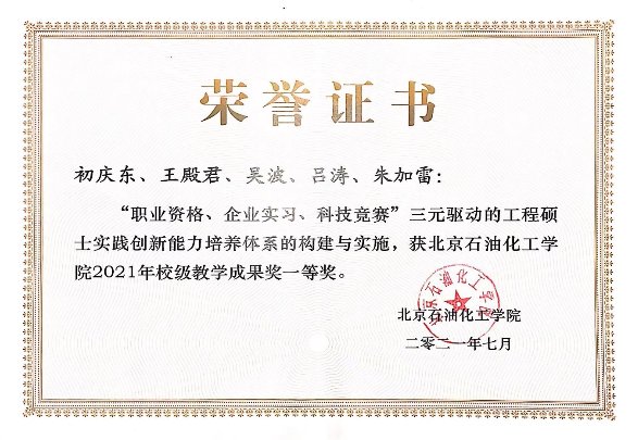 以此項(xiàng)目為依托參加了2021年校級(jí)教學(xué)成果獎(jiǎng)評(píng)選,在各教學(xué)院(系、部)擇優(yōu)推薦的基礎(chǔ)上,經(jīng)教務(wù)處資格審查,校外專(zhuān)家組函評(píng)、專(zhuān)家組會(huì)評(píng),學(xué)校教學(xué)工作委員會(huì)集中評(píng)審,機(jī)械工程學(xué)院的教師團(tuán)隊(duì)初慶東、王殿君、吳波、呂濤、朱加雷等,獲得了北京石油化工學(xué)院2021年校級(jí)教學(xué)成果獎(jiǎng)一等獎(jiǎng)。