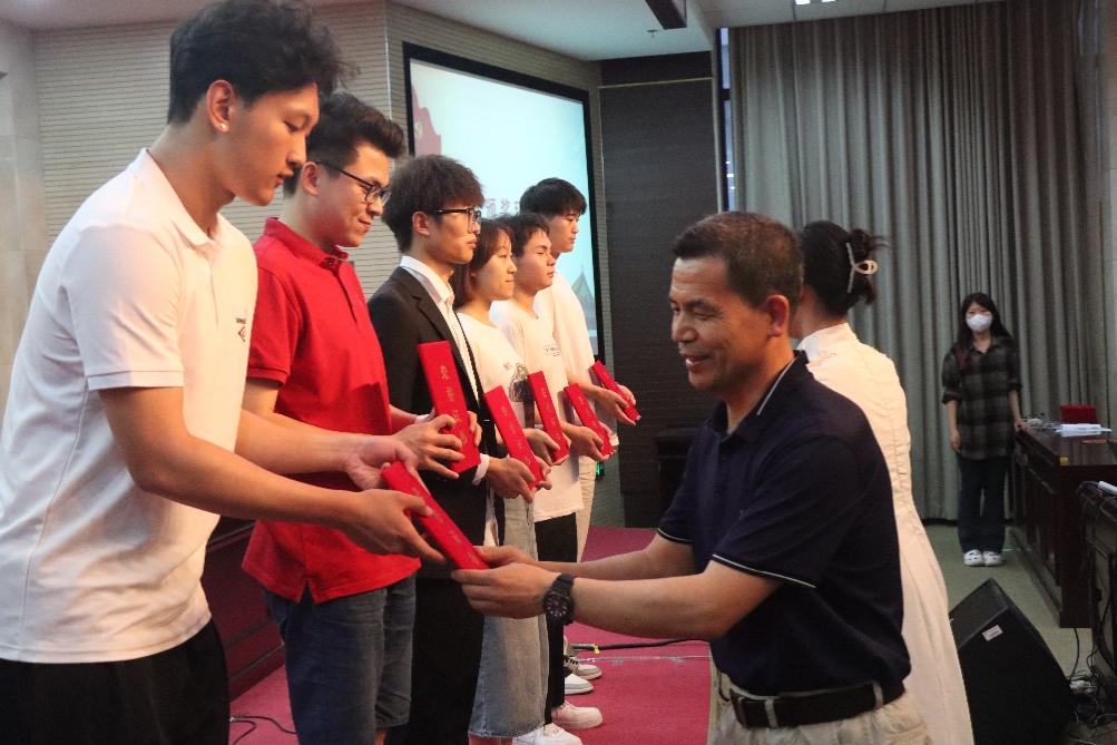校黨委副書記馮學會為一等獎參賽隊伍頒獎,并合影留念