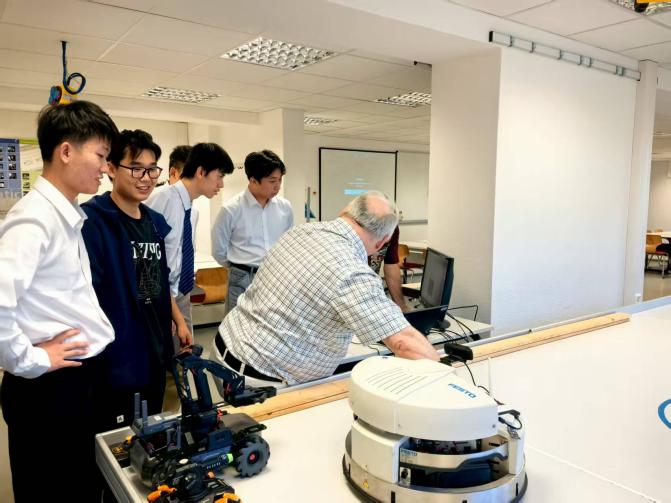 同學們還參觀了北黑森應用科技大學的實驗室,并應用機器人仿真軟件完成了機器人虛實控制避障實驗。同學們克服了看不懂軟件上德語專業詞匯的困難,通過探索每個程序節點的功能與連接方法,觀察機器人的實際變化,也了解了軟件的操作。通過實驗課程,同學們也增強了今后專業課程學習的熱情。科技交流活動還包括前往沃爾夫斯堡參觀大眾汽車城,了解汽車技術的歷史發展,探索汽車工業前沿和智能駕駛技術。