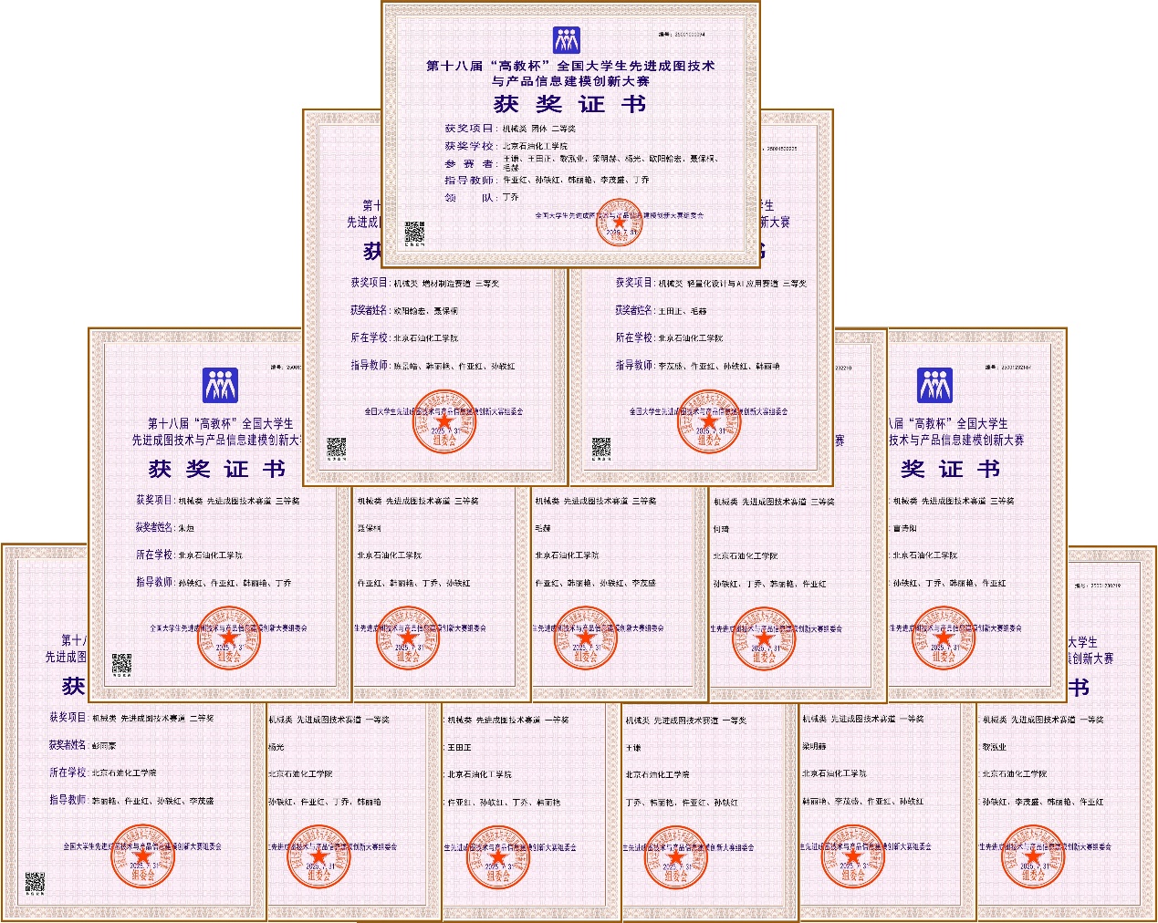 我校經過層層選拔的方式,以北京市大學生工程設計表達競賽的獲獎選手為主參加了主賽場的機械類先進成圖技術競賽。經過隊員們的努力拼搏,我校代表隊最終獲得機械類團體二等獎1項,先進成圖技術賽道個人一等獎5項,先進成圖技術賽道個人二等獎1項,先進成圖技術賽道個人三等獎5項,輕量化設計團體三等獎1項,增材制造團體三等獎1項的好成績,在所有機械參賽隊伍中總排名94位。