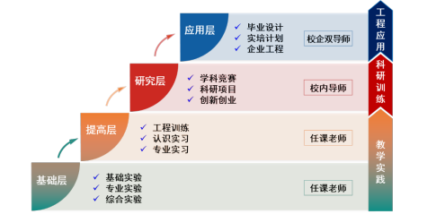 為保障高素質(zhì)應(yīng)用型人才的培養(yǎng),本專業(yè)提出“一個培養(yǎng)對象”、“兩方培養(yǎng)導(dǎo)師”、“三類實踐平臺”的創(chuàng)新實踐能力教學(xué)機(jī)制,組建“學(xué)校導(dǎo)師+企業(yè)導(dǎo)師”優(yōu)勢互補(bǔ)的師資隊伍,打造“教學(xué)實踐+科研訓(xùn)練+工程應(yīng)用”相結(jié)合的實踐能力訓(xùn)練平臺;以專業(yè)實驗、工程訓(xùn)練、認(rèn)識實習(xí)、專業(yè)實習(xí)、學(xué)科競賽、創(chuàng)新創(chuàng)業(yè)、實培計劃及企業(yè)工程等為載體,構(gòu)建了“三階段四層次”一體化創(chuàng)新實踐教學(xué)體系。