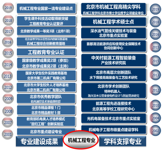 機械工程專業是2個國家級工程實踐和仿真實驗教學中心,國家級校外實踐基地,2個北京市校外人才培養基地的支撐專業。教學體系中含一門國家級一流課程和一門北京市精品課程。