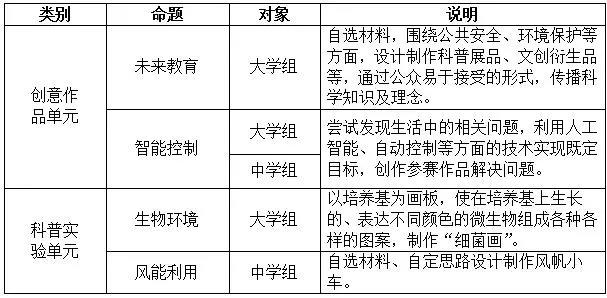 大賽設(shè)“創(chuàng)意作品”和“科普實(shí)驗(yàn)”兩個單元,其中“創(chuàng)意作品”單元設(shè)“未來教育”和“智能控制”兩個命題,著眼于現(xiàn)實(shí)問題的科普產(chǎn)品研發(fā)等;“科普實(shí)驗(yàn)”單元設(shè)“生物環(huán)境”和“風(fēng)能利用”兩個命題,突出任務(wù)驅(qū)動型活動,將競賽與科技館教育活動緊密結(jié)合。
