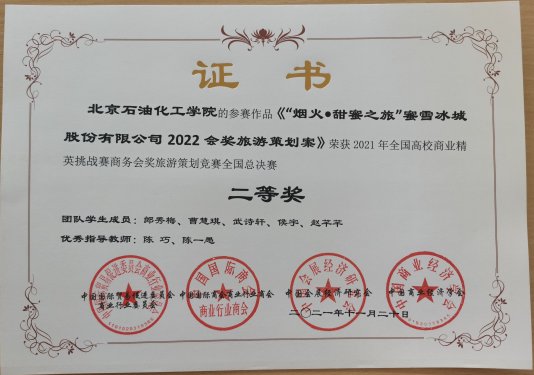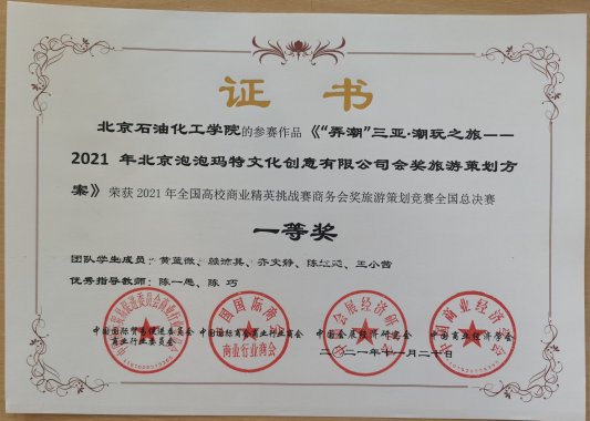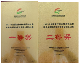 11月18日,由中國國際貿易促進委員會主辦的2021全國高校商業精英挑戰賽商務會獎旅游策劃競賽全國總決賽在線上成功舉行,由我校人文社科學院旅游與會展系陳巧、陳一愚兩位教師指導的兩組學生團隊參賽,從50多所高校的91個參賽團隊里脫穎而出。并取得全國一、二等獎的優秀成績。