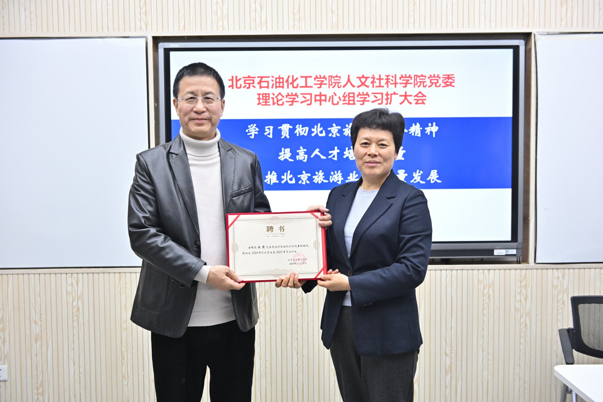 王清作為旅游業的資深專家,自1987年起便深耕于北京市旅游局、旅游發展委員會及北京市文旅局,不僅在旅游產業規劃、投融資策略、新興業態培育、項目對接及交易平臺構建等方面積累了豐富經驗,還在文化產業融合、旅游宣傳推廣、大型活動策劃及政策制定等多個維度取得了顯著成績,是行業內的佼佼者。會議伊始,舉行了莊重的兼職教授聘任儀式,劉穎書記親自為王清先生頒發聘書,聘請其擔任我校兼職教授,以進一步加強校企合作,深化產學研融合。