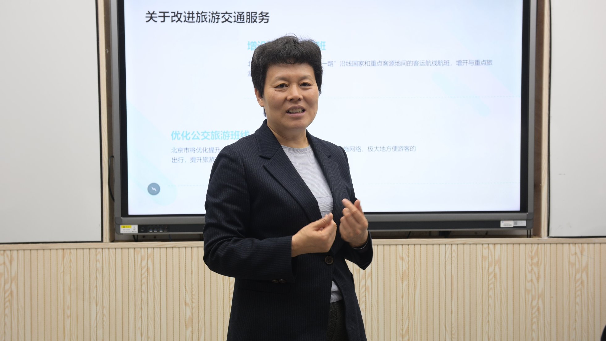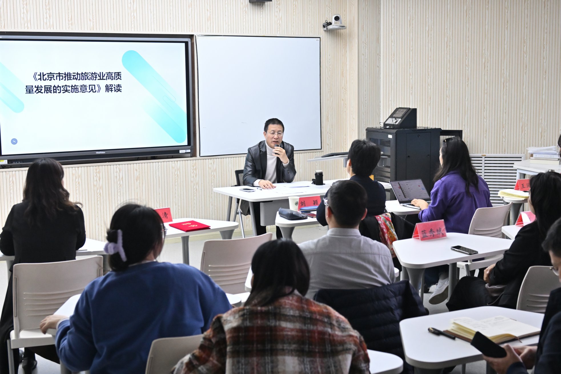 在王清教授的引領下,全體與會人員共同觀看了《北京市推動旅游業高質量發展的實施意見》的政策解讀視頻。王清教授以其深厚的理論素養和豐富的實戰經驗,從奧運賽事對北京旅游的影響切入,生動詳盡地剖析了實施意見的出臺背景、總體目標、實施路徑及保障措施,為與會者提供了一場思想盛宴。與會教師反響熱烈,紛紛表示王清先生的報告內容豐富、條理清晰,極大地拓寬了視野,增進了對北京旅游發展現狀及未來趨勢的理解。會上,教師們還就關心的具體問題與王清教授進行了深入互動,交流氛圍濃厚。