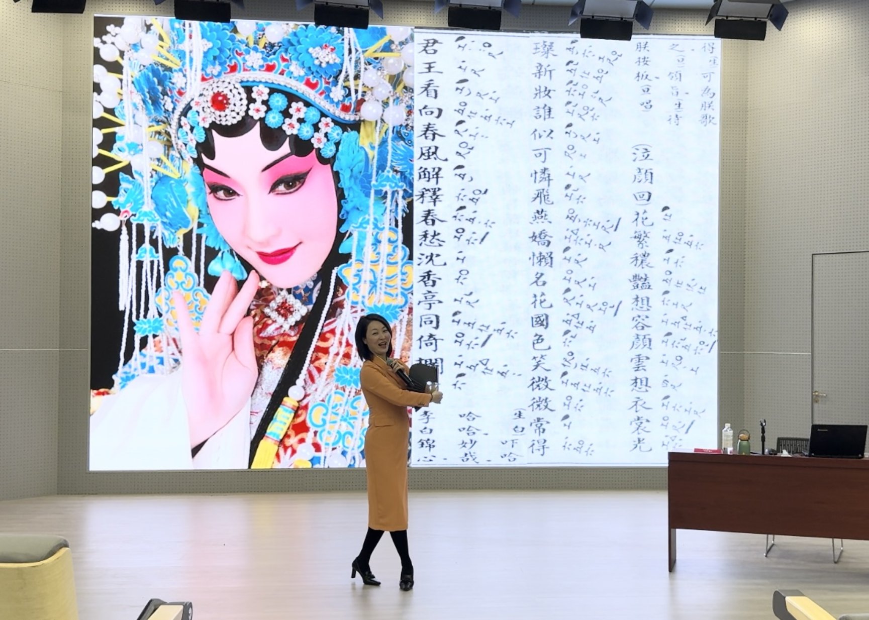 結(jié)合講座內(nèi)容,顧衛(wèi)英教授帶領(lǐng)大家鑒賞了《牡丹亭·游園》《長(zhǎng)生殿·小宴》等經(jīng)典曲目,在介紹昆曲行當(dāng)和曲詞曲譜的同時(shí),向同學(xué)們現(xiàn)場(chǎng)演示了經(jīng)典的昆曲唱段。作為中國(guó)戲劇表演最高獎(jiǎng)——梅花獎(jiǎng)大獎(jiǎng)的獲得者,顧衛(wèi)英教授以極其出彩的表演技巧讓同學(xué)們沉浸于藝術(shù)氛圍之中。現(xiàn)場(chǎng)除了熱烈的掌聲外,還不時(shí)傳來(lái)因被美所感化而帶來(lái)的低聲啜泣,顧教授展現(xiàn)出的極高藝術(shù)修養(yǎng)深深感染了在場(chǎng)師生,極大激發(fā)了同學(xué)們學(xué)習(xí)昆曲知識(shí)、探尋傳統(tǒng)文化奧秘的興趣。