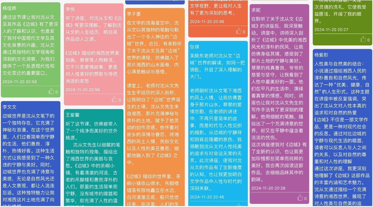 同學們還通過云班課APP發(fā)表自己的觀點,進行熱烈的課堂討論。大家紛紛表示,通過此次講座,對沈從文及其作品有了更深刻的認識,同時也激發(fā)了閱讀經典文學作品的興趣。