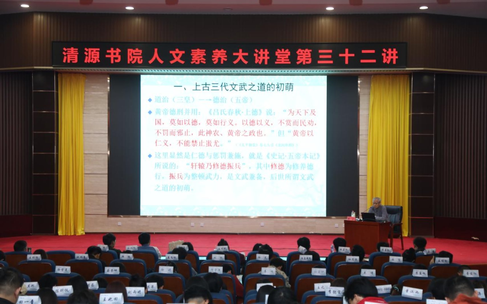 講座中韓星教授介紹了中華傳統文化中“文武之道”的萌發和發展史,并結合國學經典名篇講解其在政治、教化、修養等方面的應用以及現代啟示。