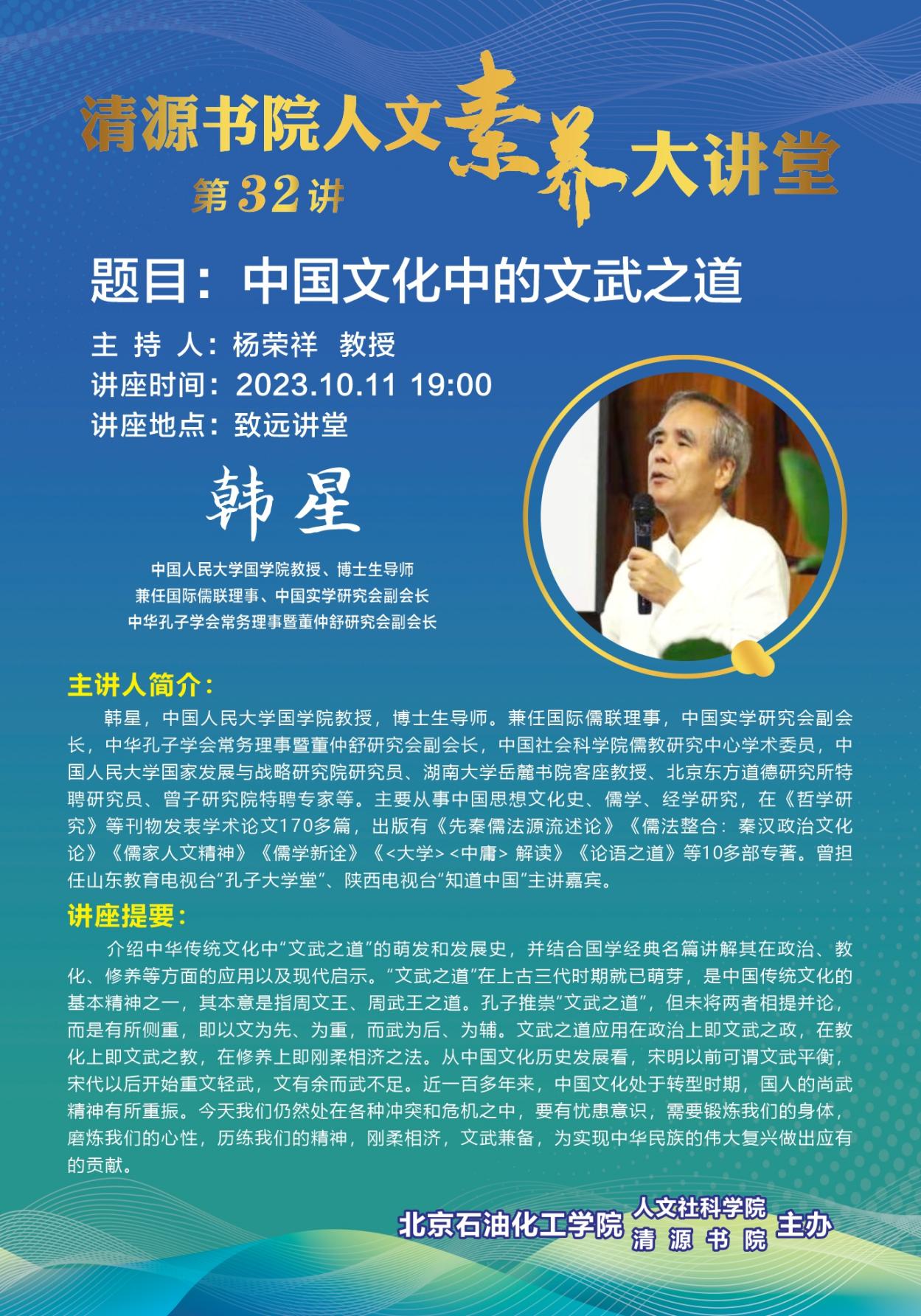 清源書院人文素養(yǎng)大講堂第三十二講:中國(guó)文化中的文武之道 時(shí)間:2023-10-11 05:07:00 來(lái)源:作者: 字體: 【小】 【中】 【大】 歡迎廣大師生參加!
