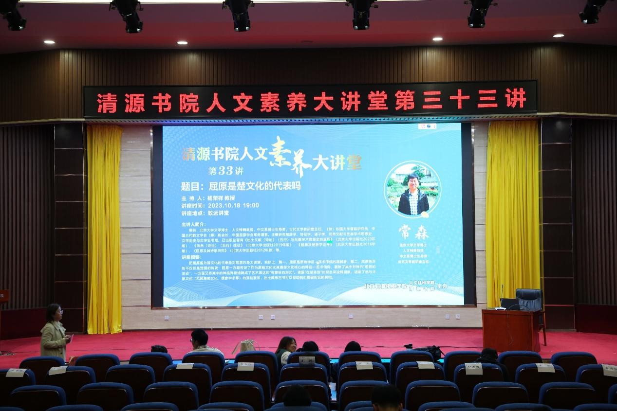 “逸響偉辭,卓絕一世”,作為“楚辭”的創(chuàng)立者和代表作家,屈原被譽為“中國浪漫主義文學的奠基人”。10月18日晚7點,清源書院人文素養(yǎng)大講堂第三十三講開講,北京大學文學博士、人文特聘教授、中文系博士生導師、古代文學教研室主任常森教授為我校師生帶來了題為“屈原是楚文化的代表嗎”的精彩講座,對我們熟悉的偉大愛國主義詩人屈原的思想進行了全新的講解。講座由清源書院院長楊榮祥教授主持,200余名師生在致遠講堂認真聆聽了常教授的講座。