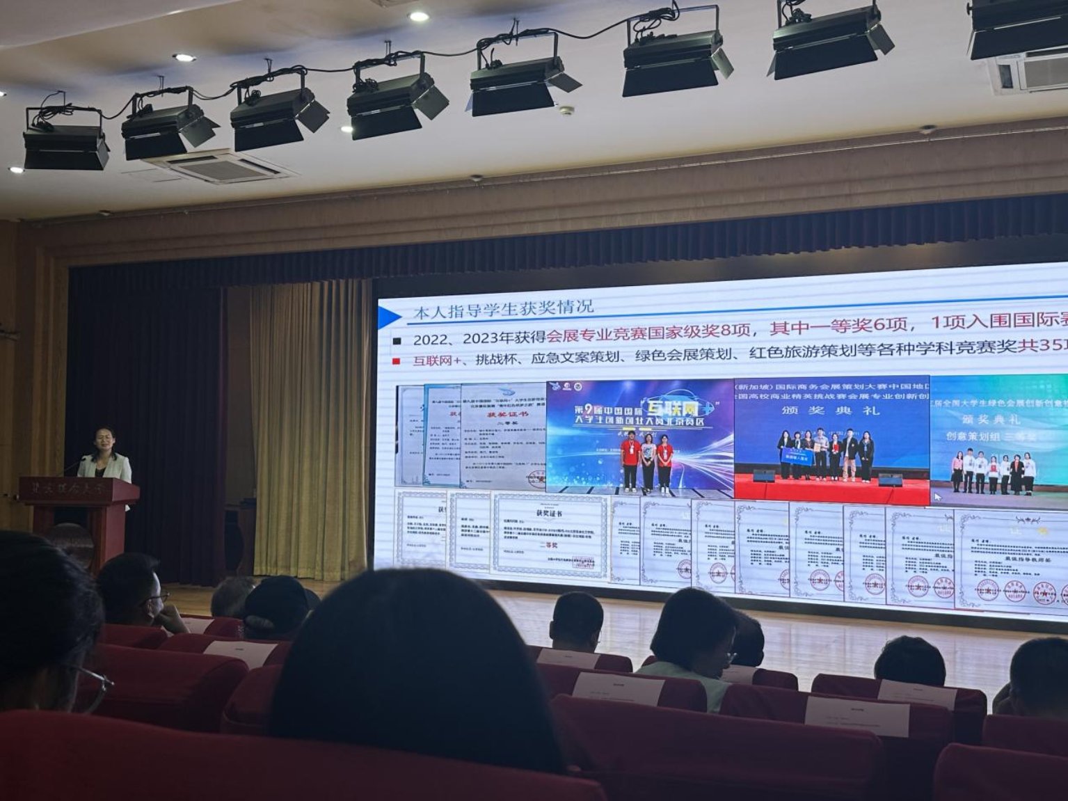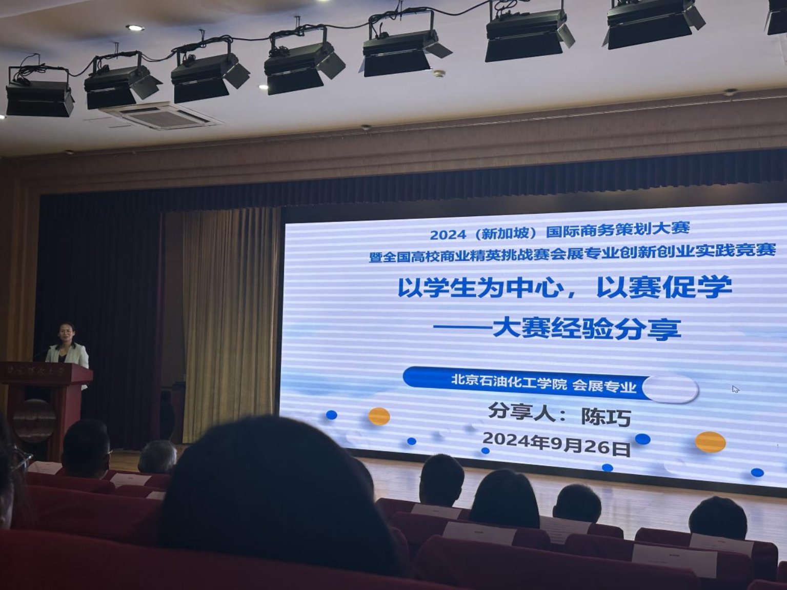 期間,陳巧老師作為特邀嘉賓做專題報告,她結合多年來專業發展及帶領學生參加學科競賽的經歷,特別是帶隊參加2024年新加坡商務策劃大賽獲得季軍的國際賽事經驗,從會展專業發展、指導教師責任、參賽學生團隊建設三個方面分享了指導學生的參賽經驗。