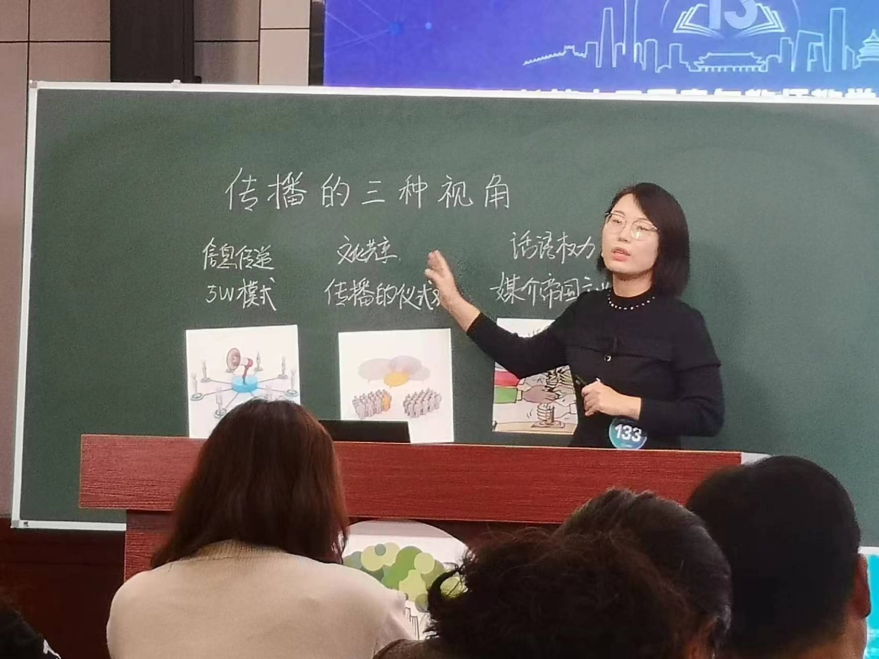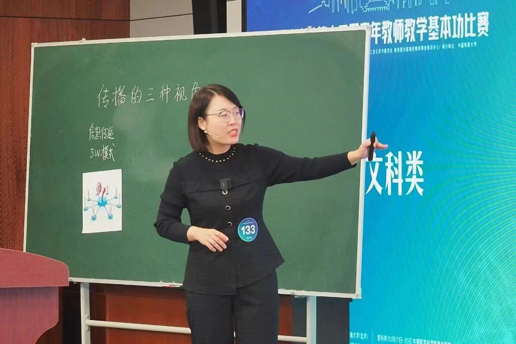 陶麗老師本次參賽課程是“傳播學概論”,抽到的比賽內容是“傳播的三種視角”。比賽中,陶麗老師以中國國家形象宣傳片為案例深入淺出地介紹了傳播的傳遞、共享和權力三種視角,作為課程引論錨定了傳播研究的三種范式,以傳播理論與專業實踐的結合引導學生講好中國故事。在比賽的20分鐘時間里,陶麗老師沉著發揮,講授流暢、條理清晰、教態大方,展現了我校青年教師的教學風采。