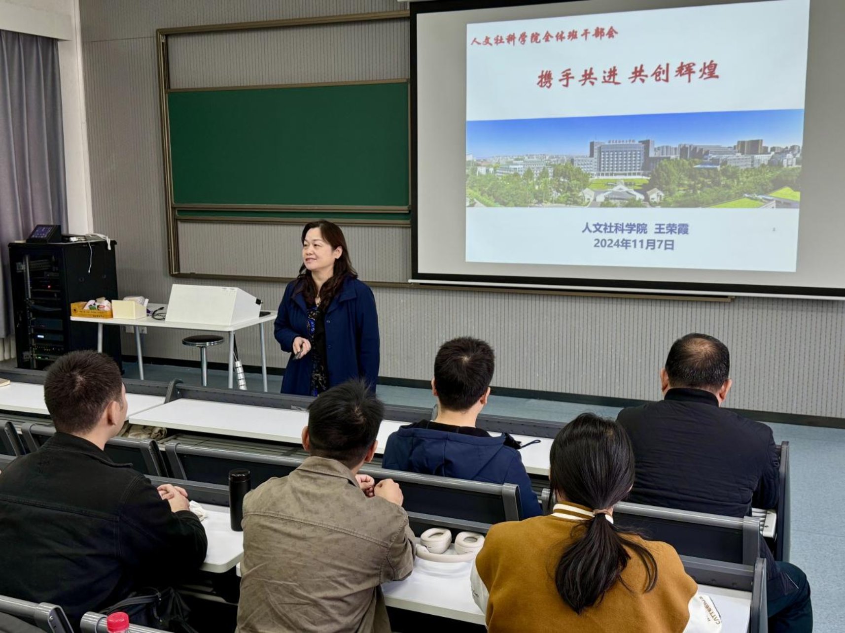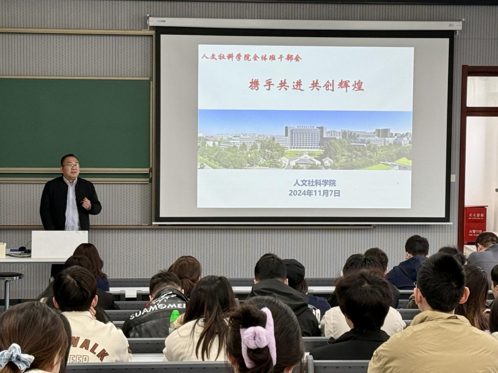 為更好發(fā)揮朋輩引領(lǐng)作用,提升班級(jí)干部的組織能力,增強(qiáng)班級(jí)凝聚力,進(jìn)一步加強(qiáng)學(xué)院學(xué)風(fēng)建設(shè), 2024年11月7日,人文社科學(xué)院在主樓4501開展班干部培訓(xùn)會(huì)。學(xué)院黨委書記王榮霞、黨委副書記兼副院長(zhǎng)鄭影、輔導(dǎo)員竇錚、王崢和全體班長(zhǎng)、團(tuán)支書等80余人參與會(huì)議。會(huì)議由輔導(dǎo)員朱明主持。