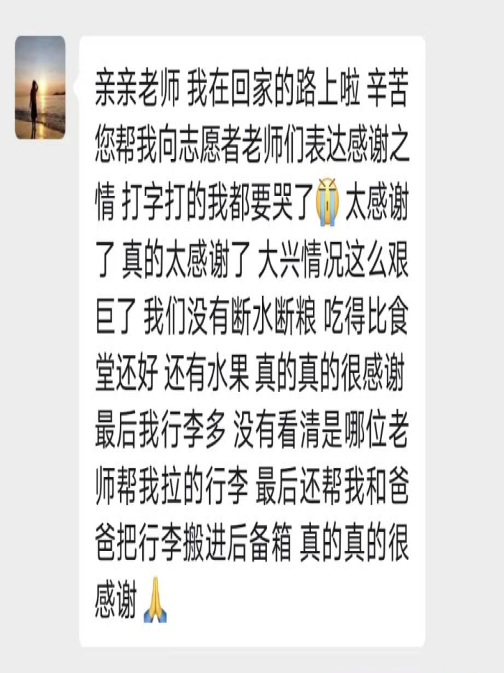 此次疫情突如其來,讓人措不及防,我覺得在我們不知道的地方,有人在為我們負重前行,國家也在盡全力守護著大家,看到我們學校的老師們、志愿者們在緊急時刻全副武裝,齊上陣,甚至有的老師是從校外趕回學校參加抗疫,真的感覺感受到了人文關懷。我認為作為大學生的我們,要積極配合工作,在學校,社會需要我們的時候挺身而出。——趙艷萌
