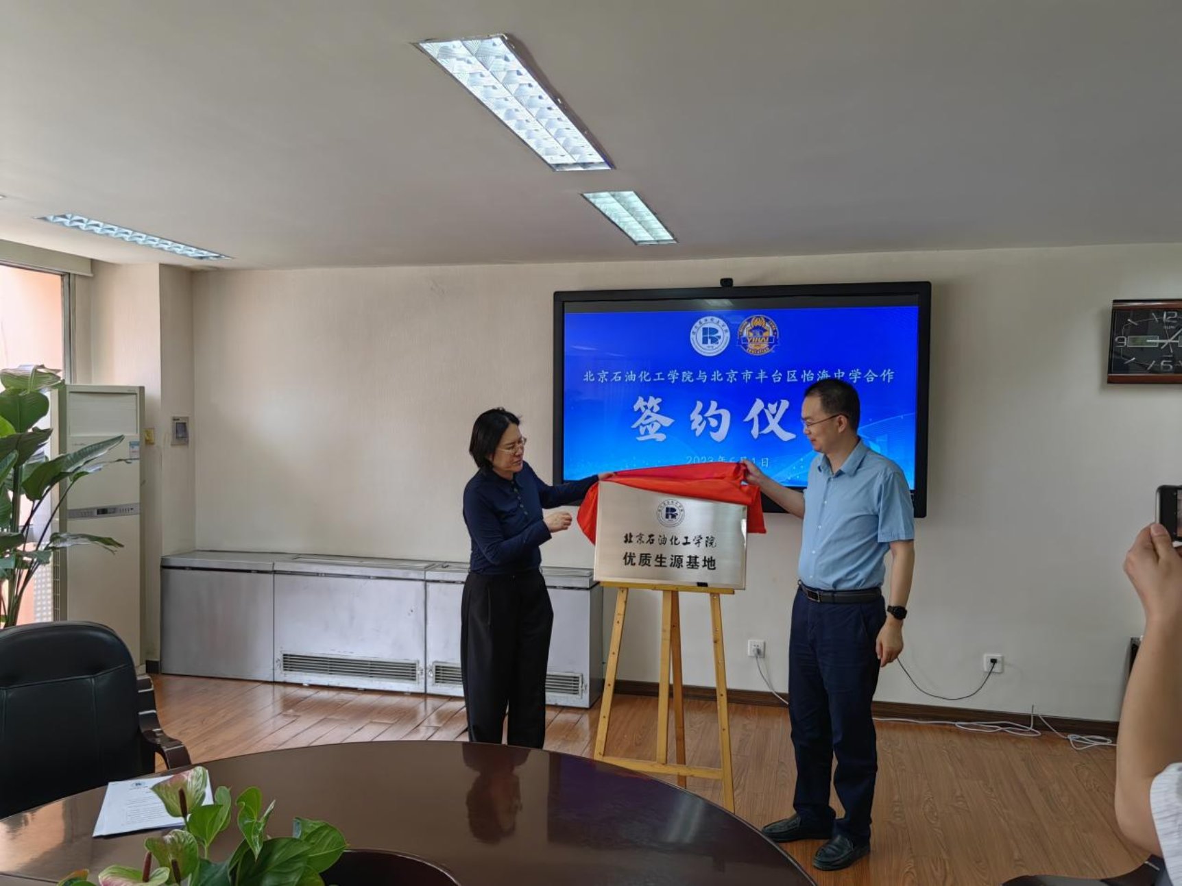 6月1日上午,北京石油化工學院與北京市豐臺區怡海中學合作備忘錄簽字暨優質生源基地掛牌儀式在怡海中學舉行。學校招生辦吳小華主任、人文社科學院王國洪副院長、旅游與會展系徐勤飛老師一行與怡海中學楊梅校長、何育竹副校長進行座談交流。吳小華主任簡要介紹了學校狀況,表示學校愿意提供現有資源幫助高中學校豐富教學內容、提升教學效果,可幫助學生及家長進行志愿填報指導。何育竹副校長介紹了怡海中學辦學理念,希望能向北京石油化工學院輸送更多優質生源。