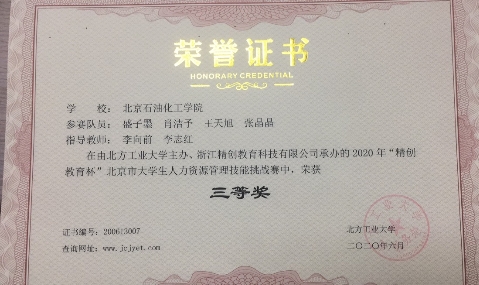 (2020年“精創教育杯”北京市大學生人力資源管理技能挑戰賽獲獎證書)