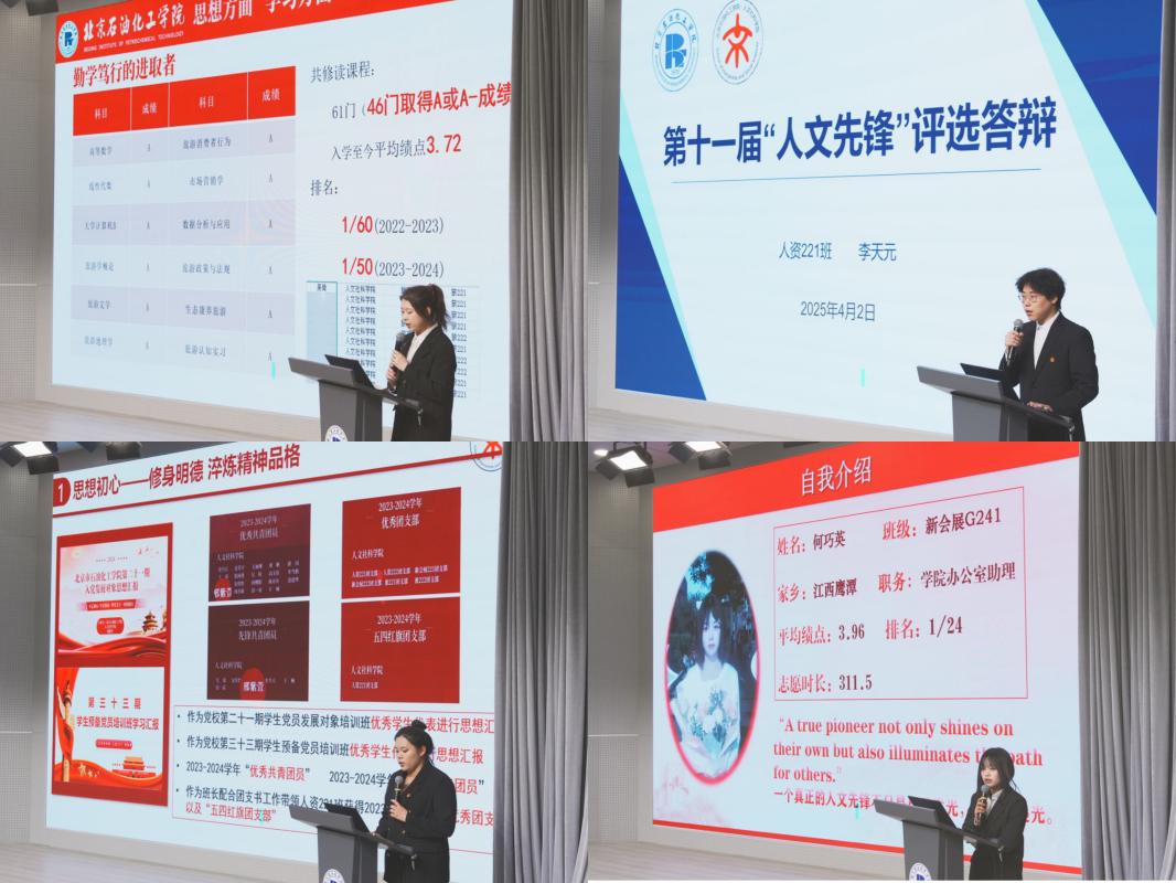 答辯現場,候選人通過PPT展示等多種形式,從思想引領、黨團班工作、學習成績、學科競賽、志愿服務、社會實踐等方面展現個人成長軌跡。參評同學既有穩居專業第一的學習標兵,也有策劃多場校園品牌活動的學生骨干,更不乏投身鄉村振興的實踐先鋒。