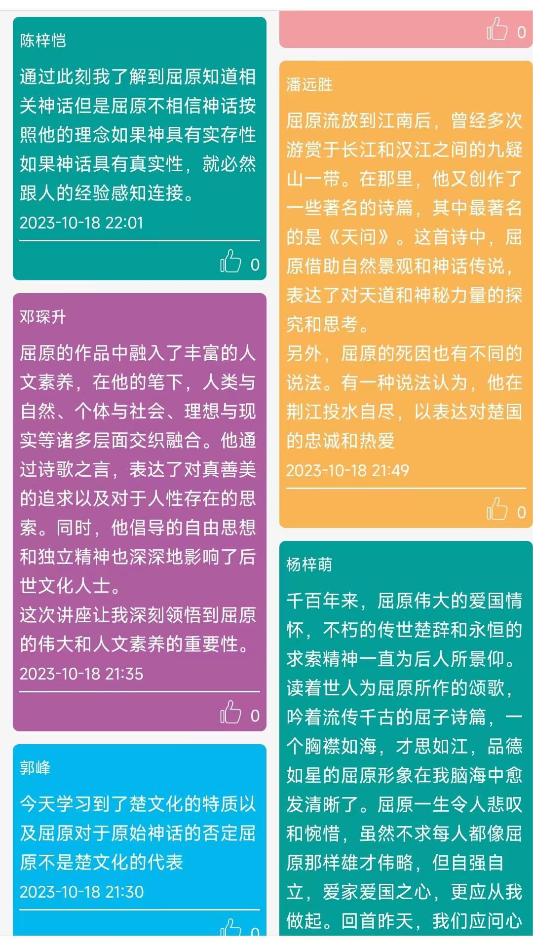 同學(xué)們在常教授講座的啟發(fā)下積極思考并熱情提問:如果說屈原對神話進(jìn)行了一定的質(zhì)疑,那為何他還在其作品中引用大量神話?屈原是否是因為政治理想無法實現(xiàn)而作《離騷》?古代不同的神話傳說間存在一定的沖突,是否由此啟發(fā)了屈原對神話的思考?《離騷》為何會成為文學(xué)經(jīng)典?常教授對這些問題一一作了精彩解答。在云班課APP上,同學(xué)們也對講座內(nèi)容進(jìn)行了大量的討論。