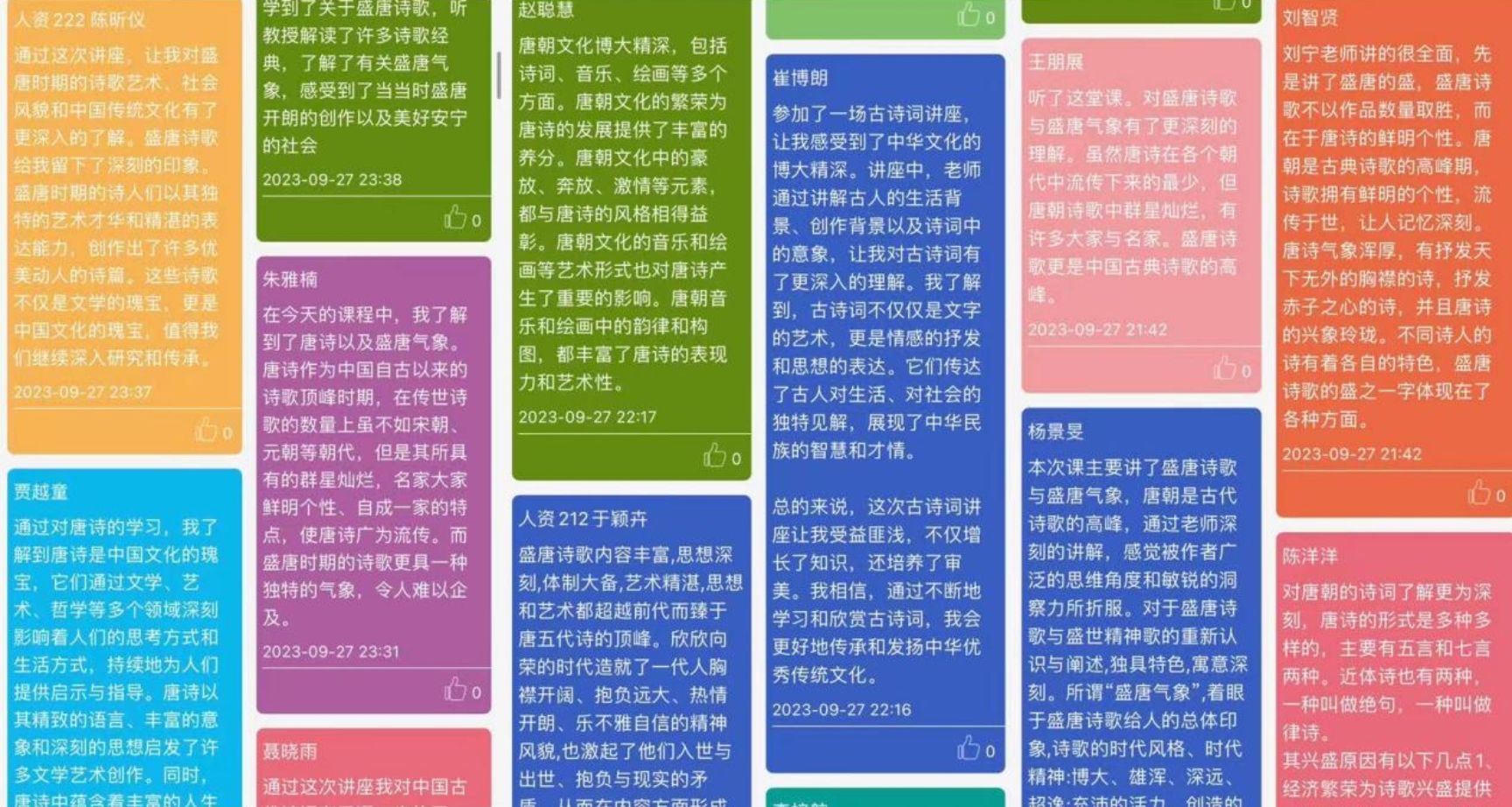 講座引起了同學們的極大興趣,同學們通過云班課APP對講座內(nèi)容進行了熱烈的課堂討論。同學們認為,結(jié)合對盛唐氣象的大背景的認識,可以幫助我們更深刻地理解盛唐詩歌的藝術成就;劉教授的講座,使我明白,我們平時耳熟能詳?shù)奶圃姡瓉砜梢宰鞒鋈绱松羁痰奈膶W藝術解讀。