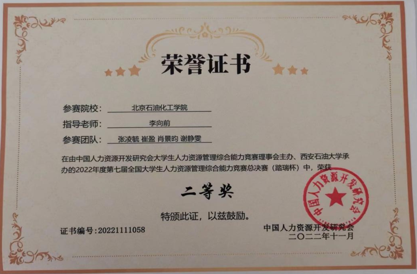 2022年11月5日,第七屆全國大學生人力資源管理綜合能力競賽全國總決賽在線舉辦。人文社科學院人力資源管理專業人資201班的張凌毓,人資202班的崔盈、肖景昀、謝靜雯四位同學組成的北京石油化工學院代表隊榮獲二等獎。