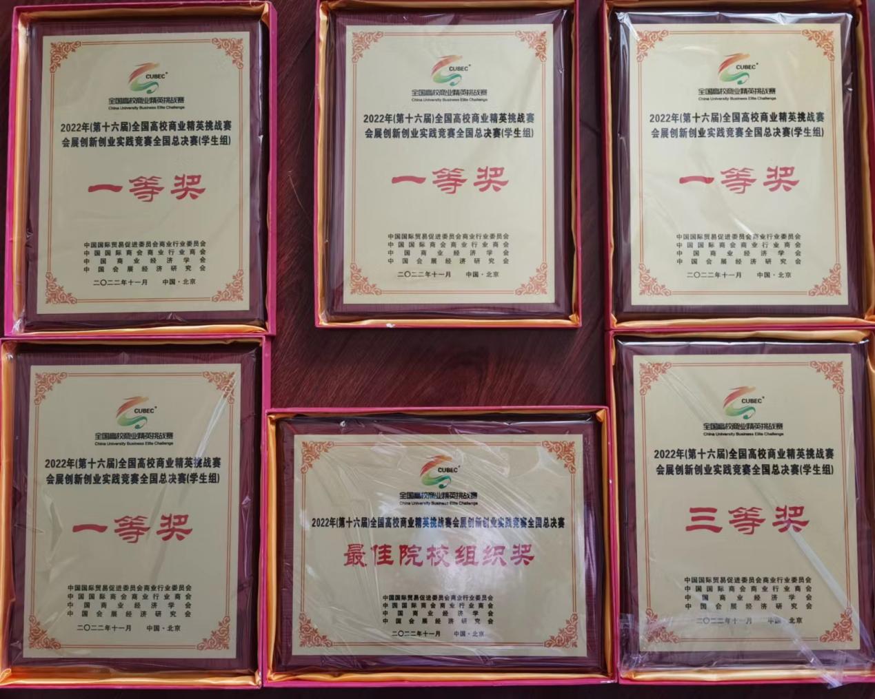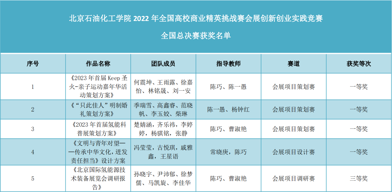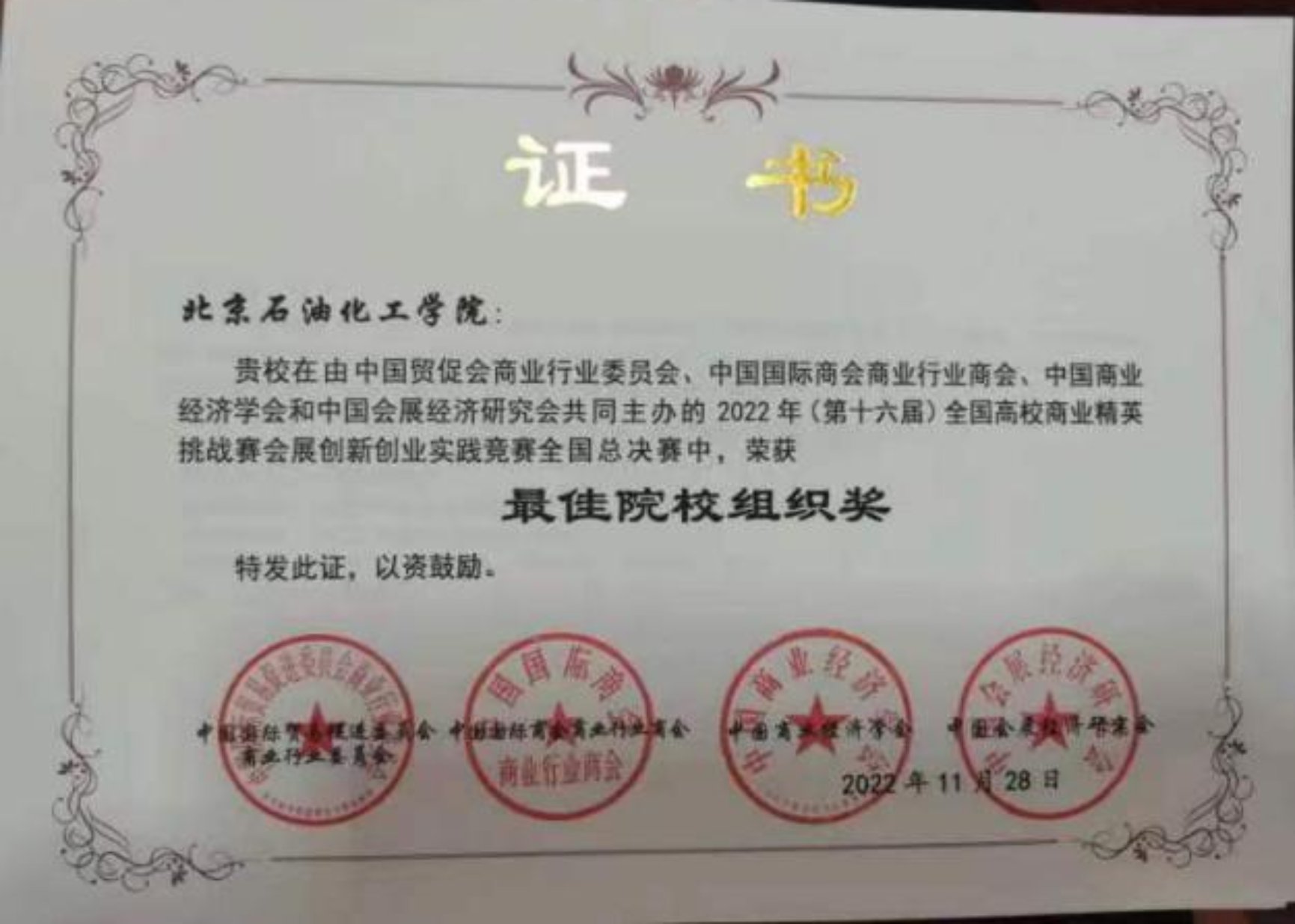 2022年11月26 -28日,由中國國際貿易促進委員會商業行業委員會、中國國際商會商業行業商會、中國商業經濟學會、中國會展經濟研究會等機構主辦的“2022年(第十六屆)全國高校商業精英挑戰賽會展創新創業實踐競賽全國總決賽”以線上方式如期舉行。本次總決賽吸引了全國28個省、市、自治區306所高校1178支(學生組1134、教師組44)參賽隊伍,6700多名選手和輔導教師參賽。經過組委會評審、作品展示、線上答辯等環節,我院5支學生團隊參與三個賽道競賽,榮獲4項國家一等獎,1項國家三等獎,陳巧、陳一愚、楊鐘紅、曹淑艷、常曉庚等五位指導老師榮獲最佳指導教師獎,北京石油化工學院榮獲“最佳院校組織獎”。