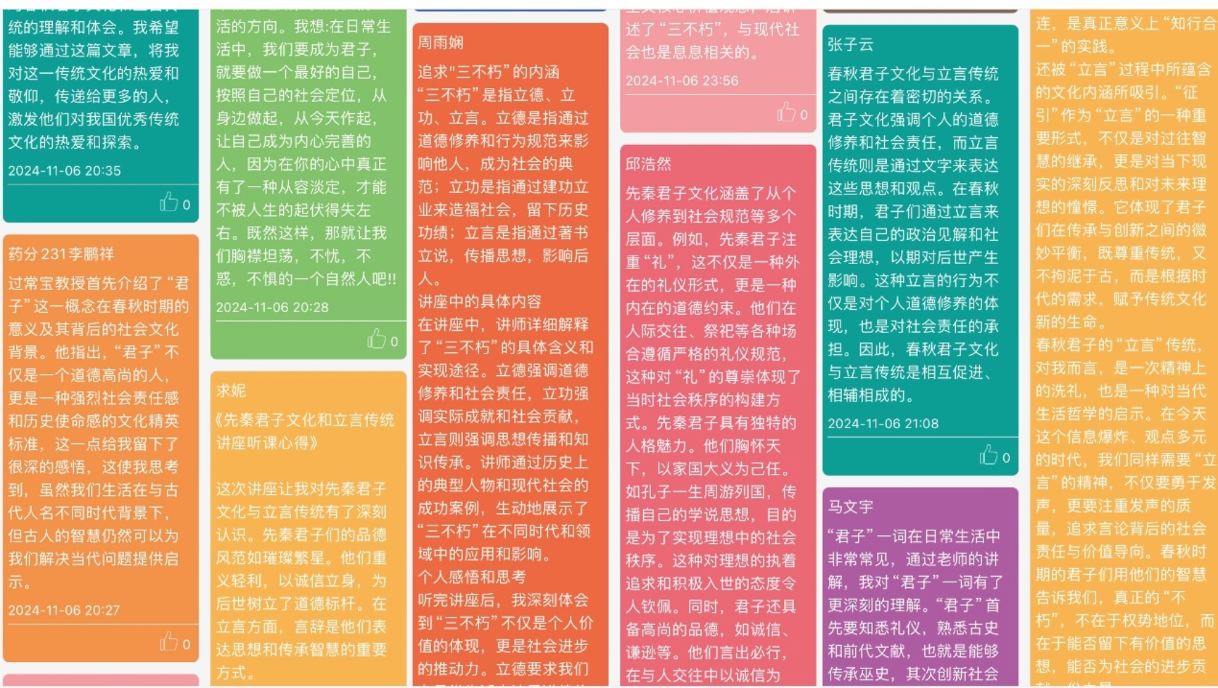 講座引發了同學們對君子文化與“立言”傳統的深入思考,同學們積極表達自己的見解并提問:“三不朽”表達了三個不同階層的價值追求——天子立德,諸侯立功,大夫立言,那么作為平民階層,該如何追求“三不朽”呢?君子文化對中國傳統文化有怎樣的影響?對現實社會又有哪些啟示意義?中國傳統文化話語形態有著怎樣的特點?中西方話語形態有怎樣的不同?過教授對這些問題一一作了精彩解答。
