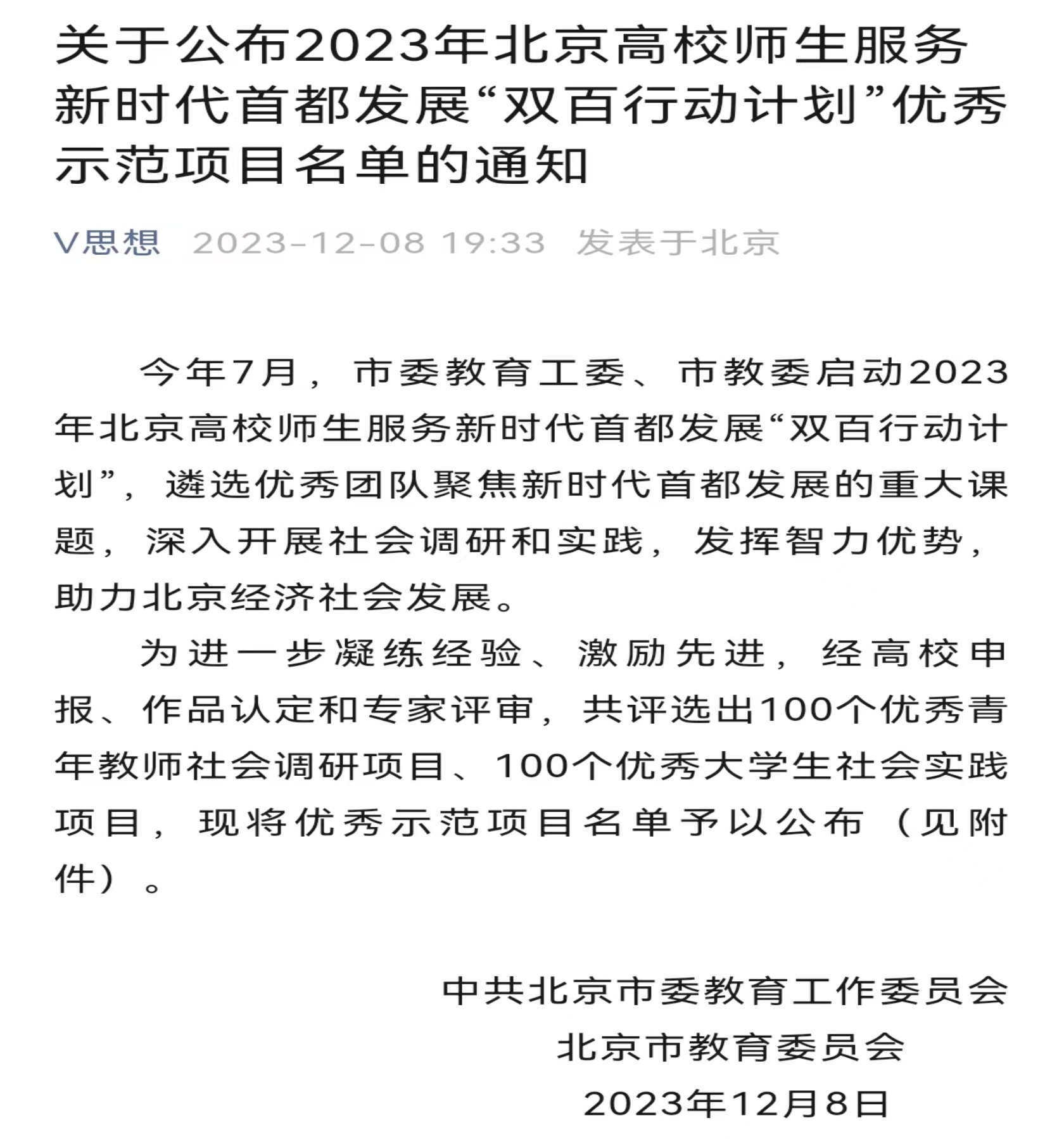 近日,從市委教育工委獲悉,學校四個項目入選2023年北京高校師生服務新時代首都發展“雙百行動計劃”。兩個青年教師社會調研團隊項目獲評2023年教師組“雙百行動計劃”優秀示范項目、兩個大學生社會實踐團隊項目獲評2023年學生組“雙百行動計劃”優秀示范項目。