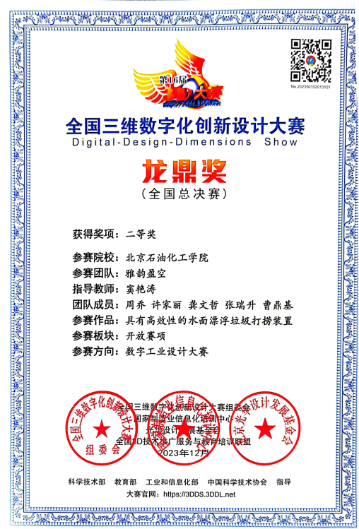入圍國賽后,參賽隊員全身心投入賽前準備,指導老師對參賽作品精心打磨,最終由朱加雷老師、李守根老師指導的“信念起源-浙江嘉興紅船智能音箱”在數字文化設計大賽賽道獲得國賽二等獎,竇艷濤老師指導的“具有高效性水面漂浮垃圾打撈裝置”、郭煒老師指導的“沙變青山-可降解生物沙袋治沙裝置” 均在數字工業設計大賽賽道獲得國賽二等獎。
