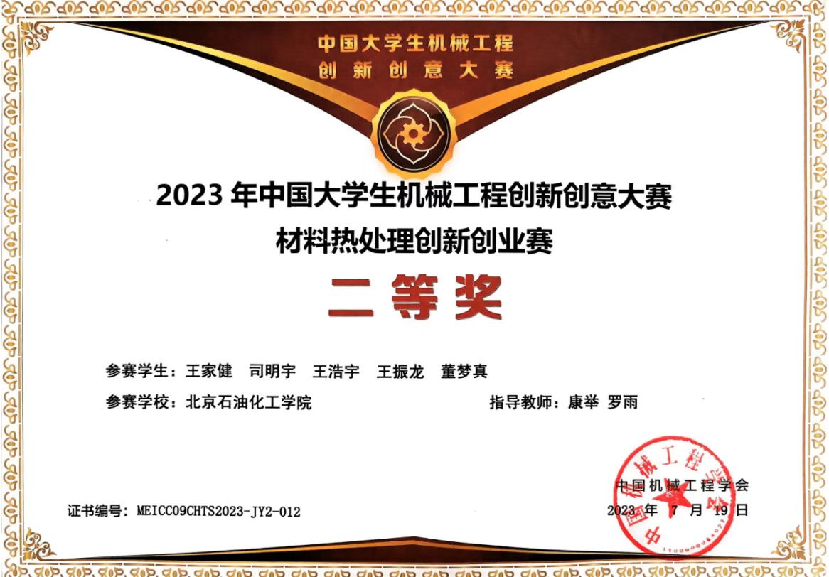 其中,由機械工程學院康舉副教授和羅雨副教授指導,王家健擔任參賽團隊組長,成員包括:司明宇、王浩宇、王振龍、董夢真,憑借在分組賽中的作品《恢復熱處理對硬度超標高溫合金螺栓應力松弛行為及微觀組織的影響》成功入圍全國總決賽。在總決賽中,他們以作品《數控機床用38CrMoAlA鋼滲氮滾珠絲杠的生產制造》榮獲二等獎。