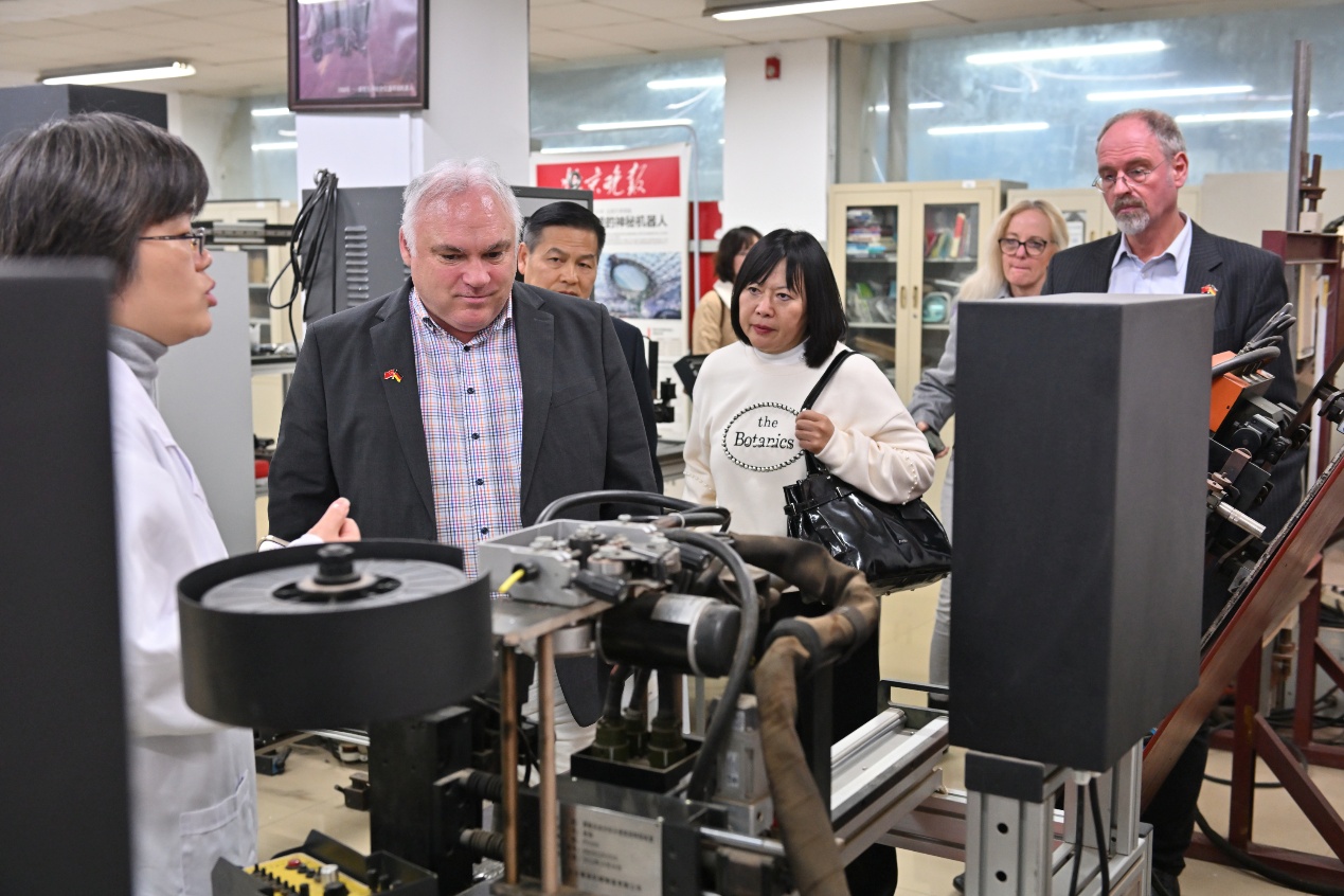 Michael Namoke副校長(zhǎng)介紹了北黑森應(yīng)用技術(shù)大學(xué)的基本情況和合作設(shè)想,談到學(xué)校是德國(guó)應(yīng)用型大學(xué)、雙元制教育的典型代表,在培養(yǎng)應(yīng)用型人才方面非常有特點(diǎn),特別是機(jī)械電子工程專業(yè)實(shí)力出眾,其教學(xué)培養(yǎng)方式得到德國(guó)企業(yè)的廣泛認(rèn)可。Michael Namoke副校長(zhǎng)希望中德機(jī)械工程班越辦越好,持續(xù)加強(qiáng)兩校在其他學(xué)科的合作。