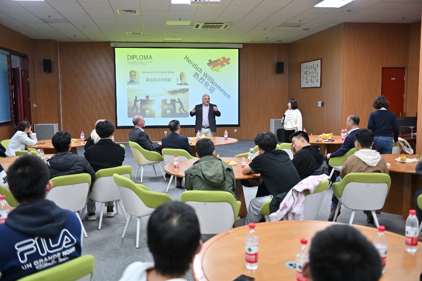 在參觀完校園后,Michael Namoke副校長(zhǎng)一行為2024級(jí)中德機(jī)械工程班學(xué)生進(jìn)行3+1項(xiàng)目宣講,就學(xué)生關(guān)心的德語(yǔ)學(xué)習(xí)等問(wèn)題進(jìn)行了廣泛而深入的交流。