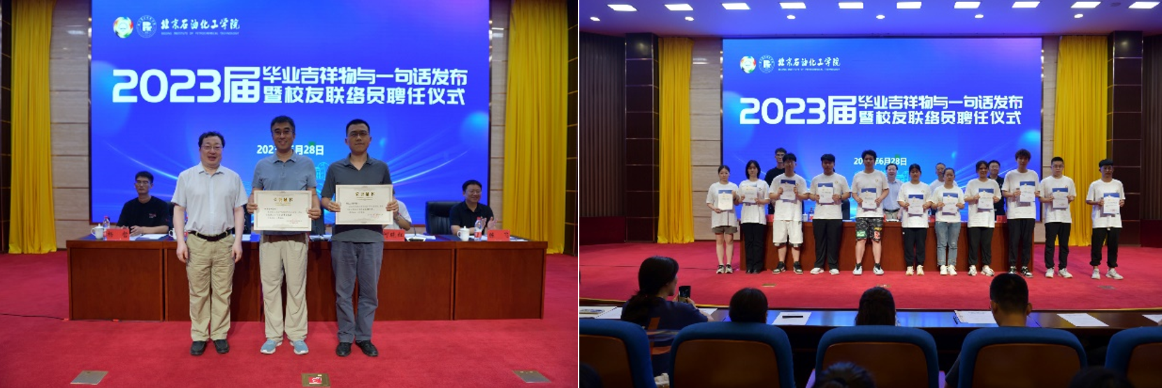 大會首先進行了2023屆畢業吉祥物與一句話發布儀式,宣布了畢業吉祥物與一句話獲獎名單,并向獲獎的17位同學與院系頒發了證書。校友聯絡員聘任儀式上,校友工作辦公室主任何曉紅宣讀了《關于聘任2023屆畢業生校友聯絡員的決定》,校領導和嘉賓為70名校友聯絡員頒發了聘書。