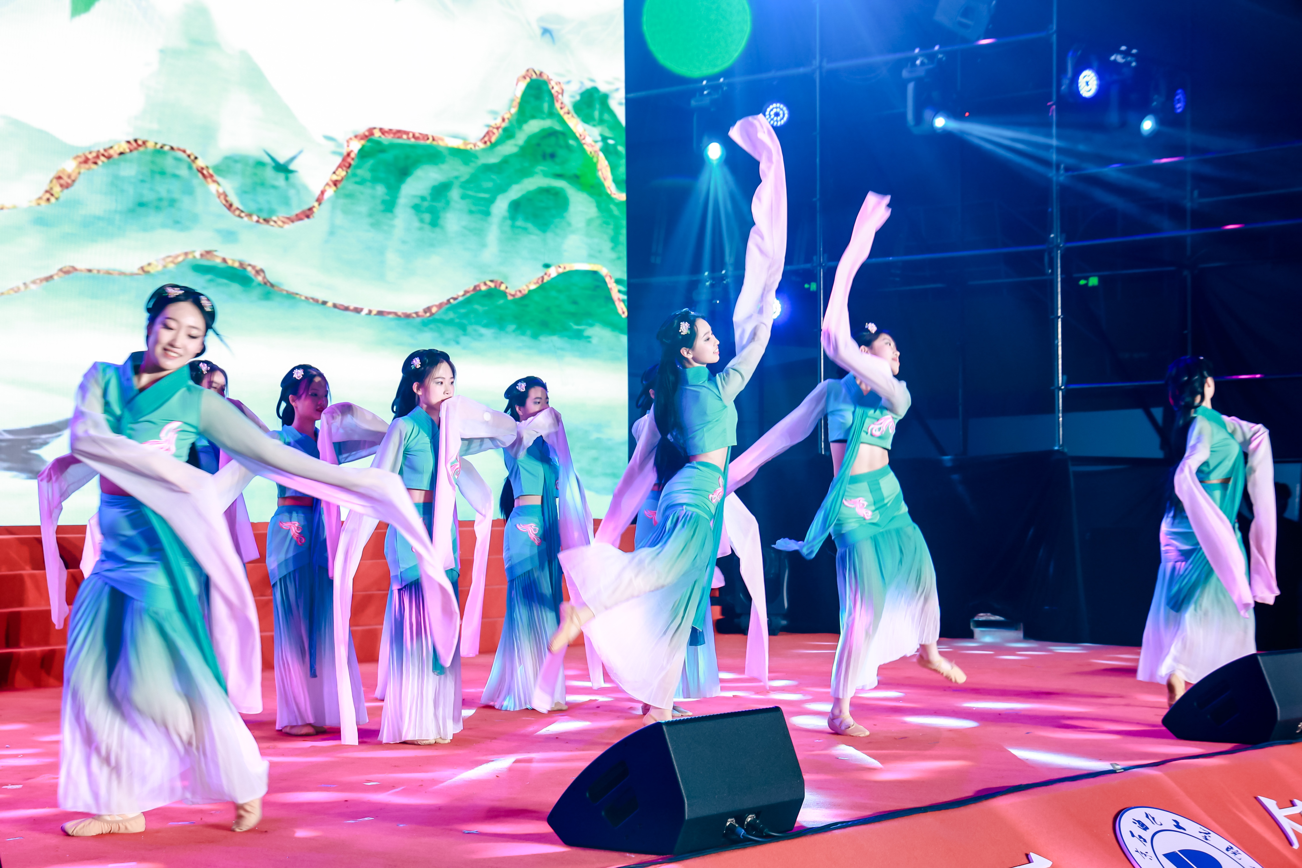 舞蹈演員們身著青衣紅袖