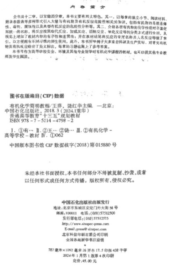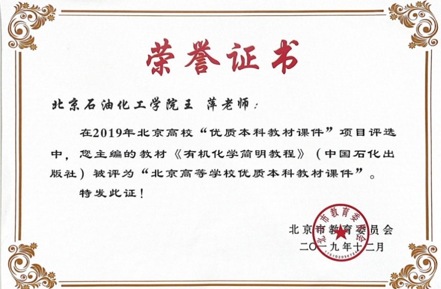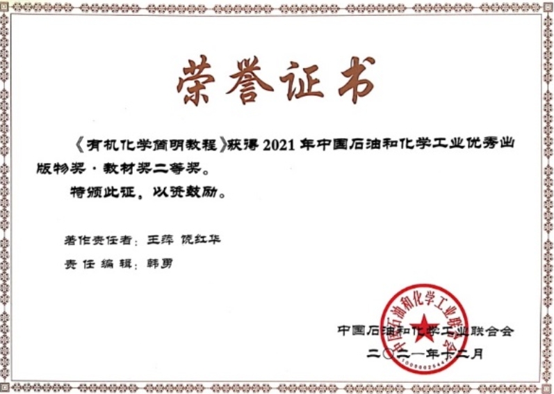 《有機(jī)化學(xué)簡明教程》由中國石化出版社在2018年3月出版,目前已印刷4次,共計(jì)6000冊。該書先后榮獲2019年“北京高校優(yōu)質(zhì)本科教材課件”,2020年“北京石油化工學(xué)院優(yōu)秀教材”,2021年“中國石油和化學(xué)工業(yè)優(yōu)秀出版物”,被我校推薦參加“紀(jì)念中國石油高等教育70周年教材展”,且被沈陽師范大學(xué)等兄弟院校選為教材使用。