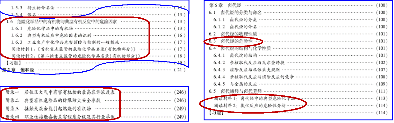 該教材在有機(jī)化學(xué)領(lǐng)域有意識地針對安全問題進(jìn)行了補(bǔ)充介紹,以期助力實(shí)驗(yàn)室安全與化工生產(chǎn)安全。比如,章節(jié)末尾的閱讀材料對各類典型有機(jī)物和常見有機(jī)反應(yīng)進(jìn)行了危險(xiǎn)性相關(guān)知識的介紹。其中,“閱讀材料 1”主要介紹了本章同類有機(jī)物中的典型危險(xiǎn)化學(xué)品;“閱讀材料 2”則分別針對某一類具體的有機(jī)反應(yīng)進(jìn)行了專門的危險(xiǎn)性分析。此外,在書的結(jié)尾處以附錄的形式附上“典型有機(jī)危險(xiǎn)品的防爆防火安全參數(shù)”、“接觸或混合能引起燃燒的有機(jī)物”等資料供學(xué)生查閱,以期提高學(xué)生的安全意識與規(guī)則意識。