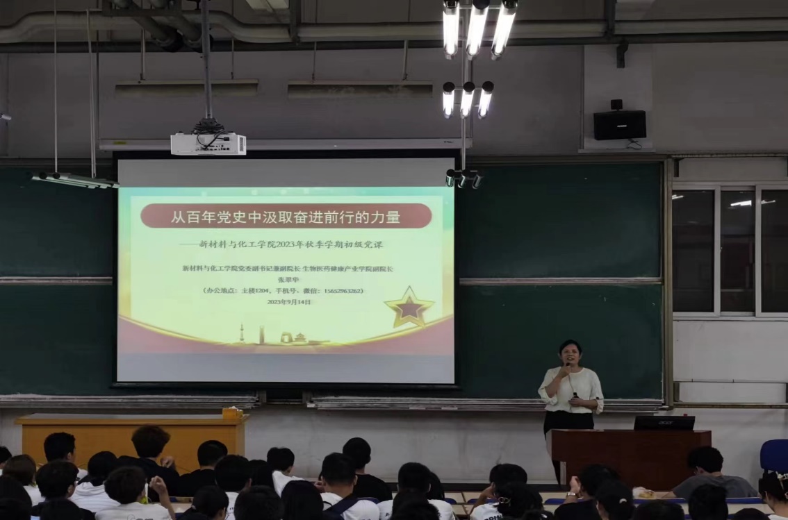 9月14日晚18:30,新材料與化工學(xué)院黨委在教102、教104組織開展了2023級(jí)新生初級(jí)黨課培訓(xùn),學(xué)院黨委副書記張翠華和組織員任蘋為新材料與化工學(xué)院480余名2023級(jí)本科生和研究生進(jìn)行了初級(jí)黨課培訓(xùn)。該培訓(xùn)活動(dòng)旨在落實(shí)學(xué)校新生引航工程,加強(qiáng)對(duì)新生思想引領(lǐng),引導(dǎo)新生堅(jiān)定理想信念,積極向黨組織靠攏。