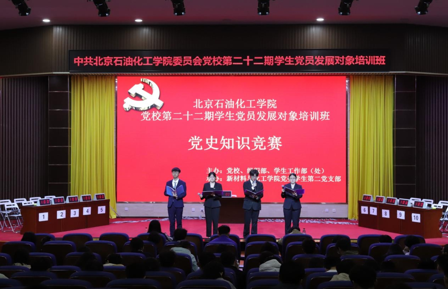 2024年10月20日下午,由北京石油化工學(xué)院黨校主辦,新材料與化工學(xué)院黨委學(xué)生第二黨支部承辦的的第二十二期發(fā)展對象培訓(xùn)班黨史知識競賽在致遠大講堂舉辦。活動旨在學(xué)習(xí)貫徹黨的二十屆三中全會精神,提高學(xué)生黨員發(fā)展對象的思想覺悟,進一步促進學(xué)生黨員發(fā)展對象對黨的最新理論成果的學(xué)習(xí)和了解,不斷提高政治理論水平。馬克思主義學(xué)院鄭艷老師、學(xué)生工作部趙家藝?yán)蠋焻⒓?/span>了此次活動。