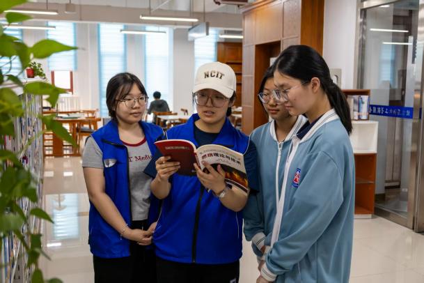活動(dòng)三:圖書館參觀,大興八中師生們分組在圖書館老師和學(xué)生志愿者帶領(lǐng)下,穿梭于三層英語(yǔ)類、四層化學(xué)類書籍區(qū)域。同學(xué)們自由閱讀,沉浸在知識(shí)海洋,志愿者們適時(shí)講解圖書館借閱規(guī)則和書籍分類知識(shí),幫助大家更好地利用圖書館資源。大家在不同類別書架間穿梭,沉浸于知識(shí)的海洋,感受著濃厚的學(xué)術(shù)氛圍。