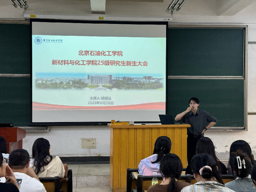 迎新結束后,新材料與化工學院研究生輔導員徐碩遠老師,開展了新生年級大會。會上他強調,研究生不僅要專注于學術研究,也要注重綜合素質的提升,努力成長為能夠服務國家發展戰略和行業需求的高層次人才,并表示研究生生活充滿機遇與挑戰。在北京石油化工學院,希望同學們以夢為馬,不負韶華,勇敢探索實踐,在知識海洋中遨游,在青春賽道上奔跑,書寫屬于自己的精彩篇章。